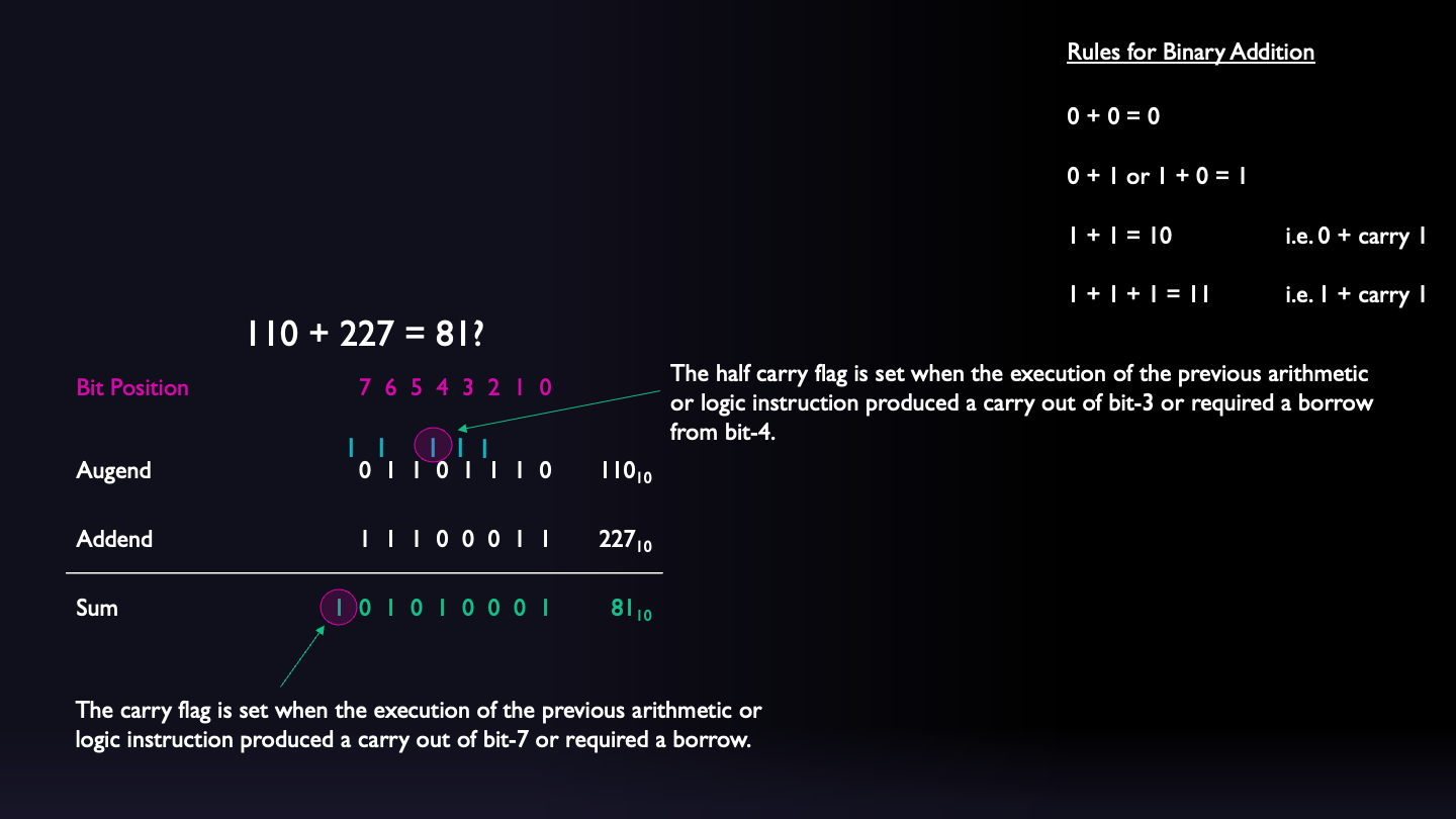 | Bit 0 | Carry Flag (C) | The carry flag is set when the execution of the previous arithmetic or logic instruction produced a carry out of bit-7 or required a borrow. |